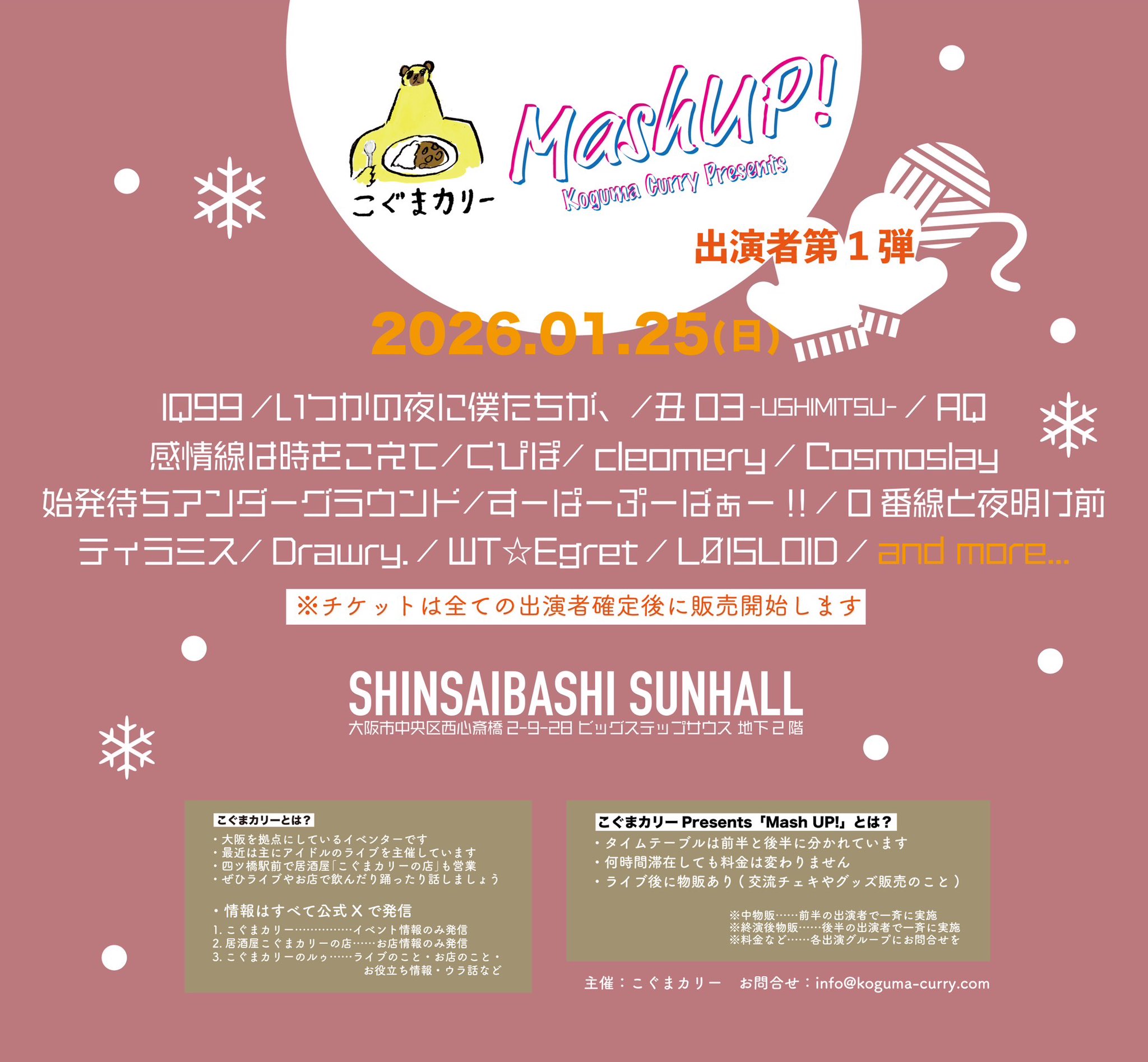 2026 1/25 1/25(日)心斎橋SUNHALL こぐまカリーPresents「Mash UP!」こぐまカリーPresents「Mash UP!」1/25(日)心斎橋SUNHALL🎫すべての出演者確定後に販売開始他詳細は後日発表 Post Share Line RSS note LIVE & SCHEDULE一覧